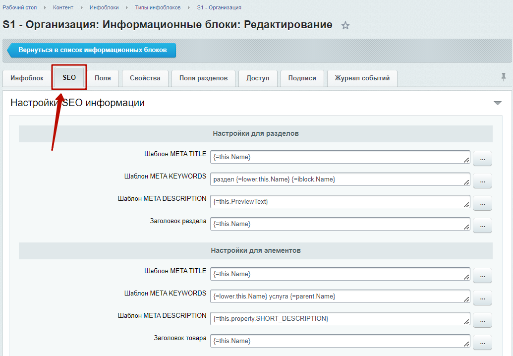 Настройка SEO информации