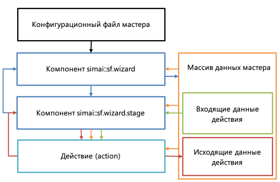 Компонент simai::sf.wizard использует данные конфигурационного файла для формирования массива данных мастера и сохраняет информацию в хранилище.