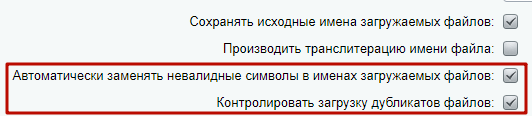 Шаг 3. Для того чтобы невалидные символы в именах загружаемых файлов не мешали функционалу на сайте, нужно также установить активными галочки параметров "Автоматически заменять невалидные символы в именах загружаемых файлов" и "Контролировать загрузку дубликатов файлов".