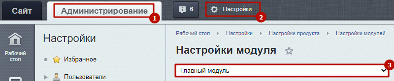 Шаг 1. Перейти в Администрирование > Настройки > Главный модуль.