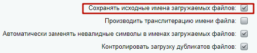 Шаг 2. Установить активной галочку параметра "Сохранять имена загружаемых файлов".