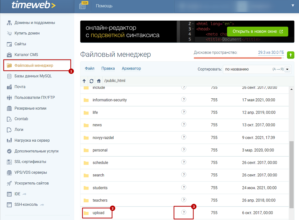 Также вы можете провести анализ занятого места с помощью данной инструкции https://timeweb.com/ru/docs/virtualnyj-hosting/drugie-voprosy-i-instrukcii/analiz-diskovogo-prostran...