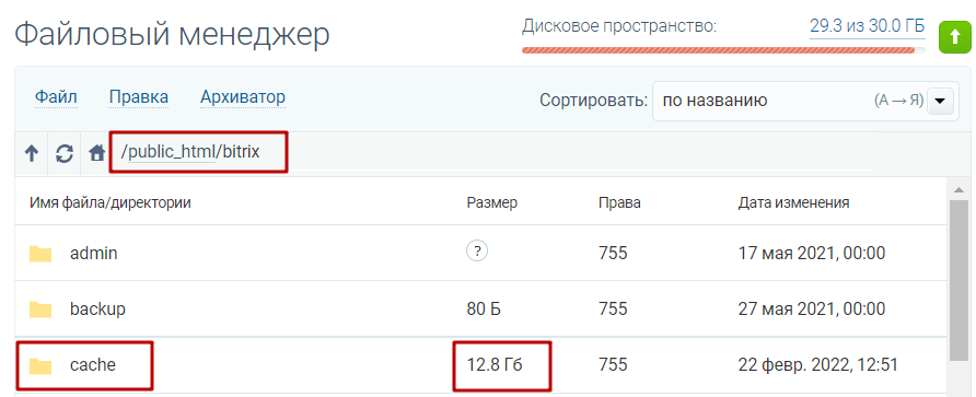 3. /bitrix/cache/ - кеш. В данном примере проблема как раз в кеше.