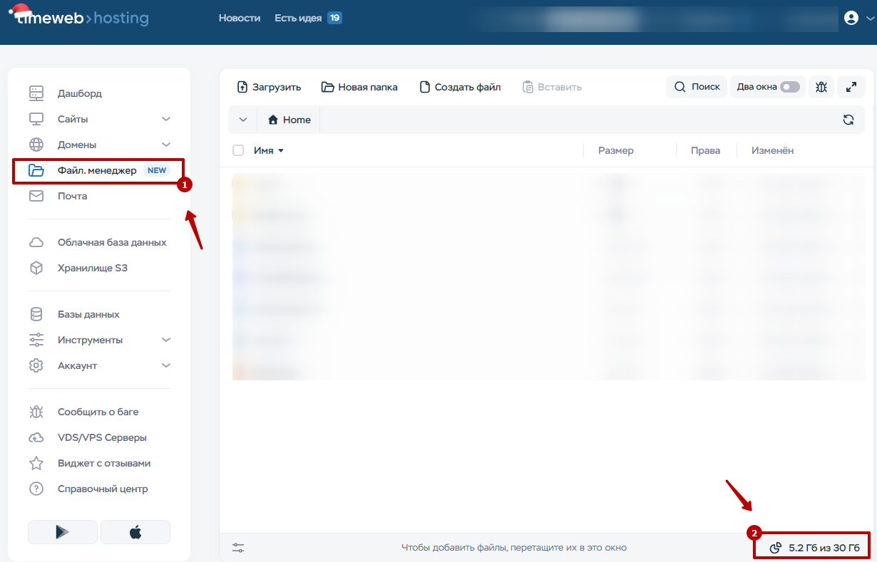 Для того чтобы увеличить дополнительное место на хостинге вы на текущем тарифе скорректировать объем выделяемого места. Для этого вам необходимо перейти в раздел файловый менеджер и нажать кнопку со стрелкой вверх.