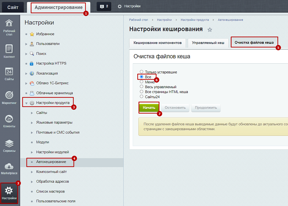 2. Кеш сайта не очищается. Кеш сайта используется для ускорения работы сайта и содержит кешированные данные информации сайта. После обновления информации кеш обычно очищается от старых данных и добавляет новые. В редких случаях происходит сбой, и старые данные не удаляются. Вы можете попробовать удалить кеш в ручную. Для этого перейдите в административный раздел сайта и там выберите: Настройка (в левой панели) - "Настройка продукта" - "Автокеширование". Далее выберите вкладку "Автокеширование" в нем пункт "Все" и нажмите кнопку начать.