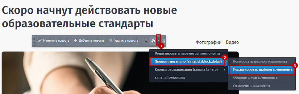 Шаг 1. Во включенном режиме правки навести курсор мыши на область элемента (на детальной странице). Нажать на стрелочку возле шестерёнки > Элемент детально > Редактировать шаблон компонента.