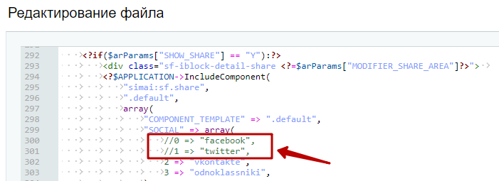 Шаг 4. Закомментировать строки с социальными сетями (прописать //). Сохранить изменения.