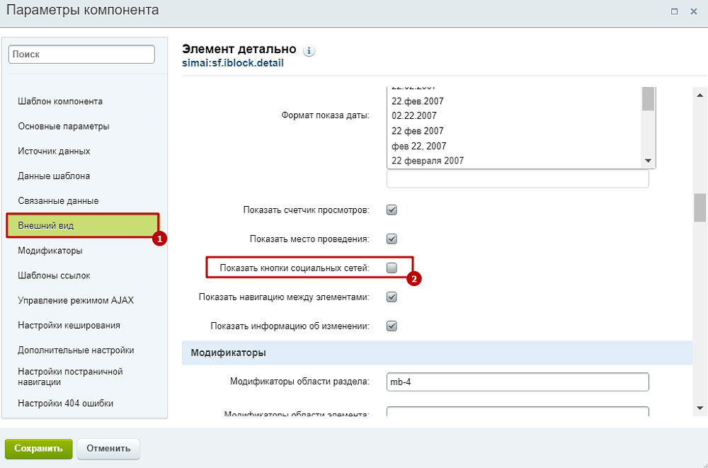 Шаг 2. Во включенном окне настройки параметров компонента перейти во вкладку "Внешний вид". У параметра "Показать кнопки социальных сетей" снять галочку. Сохранить изменения.