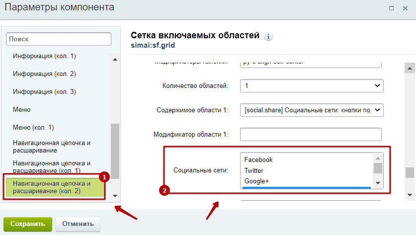 Шаг 3. В окне настройки параметров компонента найти строку "Навигационная цепочка и расшаривание" (кол.2).