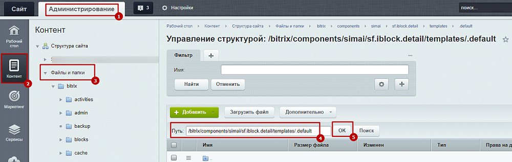 Шаг 2. Перейти в Администрирование > Контент > Файлы и папки.