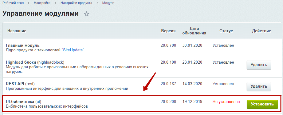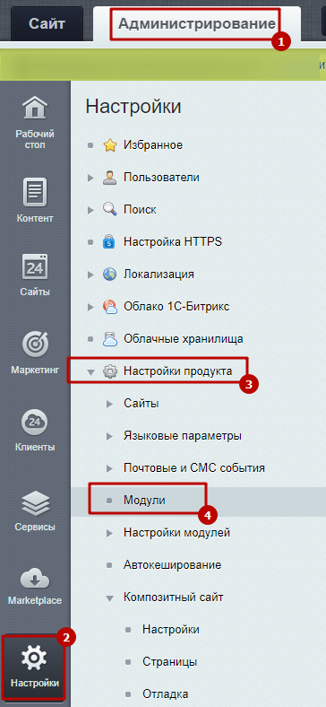 Шаг 1. Перейти в Администрирование > Настройки > Настройки продукта > Модули.