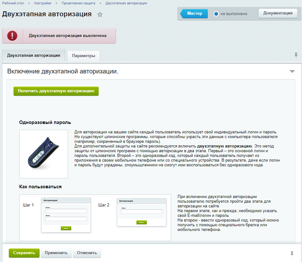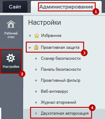 Двухэтапная авторизация настраивается через модуль проактивной защиты (Настройки > Проактивная защита > Двухэтапная авторизация).