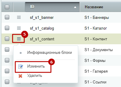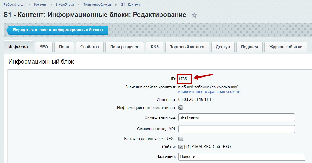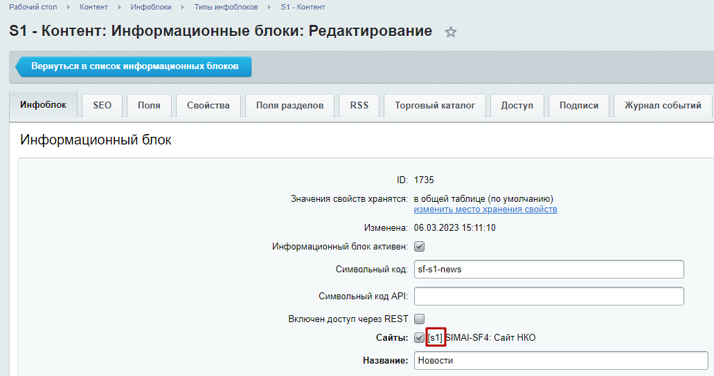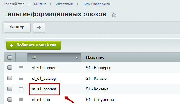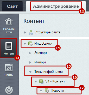 Шаг 2. Изменить нужный тип инфоблока. Например, инфоблок "Новости", принадлежит типу "Контент". Вносим изменения для него.