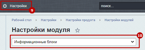 Шаг 4. Перейти в настройки модуля "Информационные блоки" (Настройки > Настройки продукта > Настройки модулей > Информационные блоки).