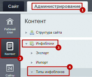 Шаг 1. Перейти в Администрирование > Контент > Инфоблоки > Типы инфоблоков.
