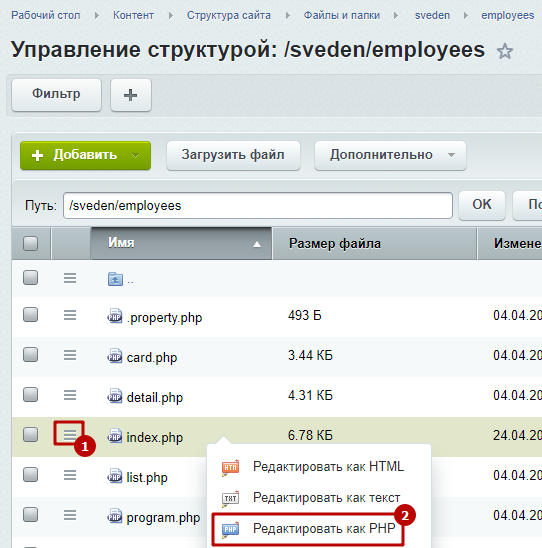Шаг 2. Открыть файл index.php в режиме PHP-кода.