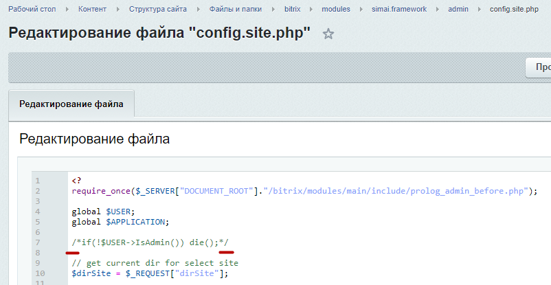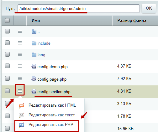 Шаг 3.4. В этой же папке /bitrix/modules/simai.framework/admin/ открыть файл config.page.php в режиме редактирования PHP-кода.