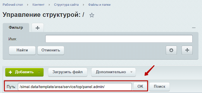 Шаг 2.1. В поисковой строке прописать путь /simai.data/template/area/service/top/panel.admin/ и нажать "ОК".