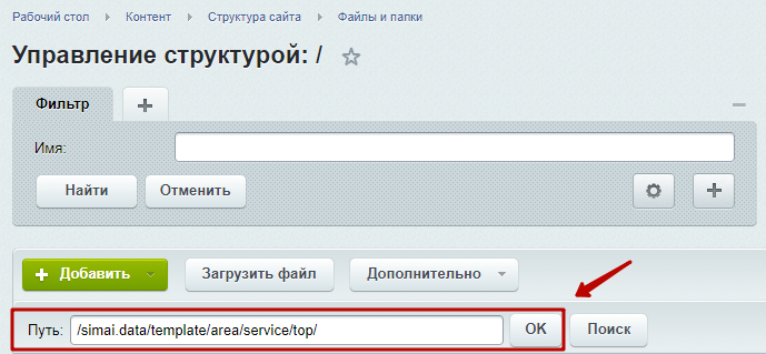 Шаг 1.2. В поисковой строке прописать путь /simai.data/template/area/service/top/ и нажать "ОК".
