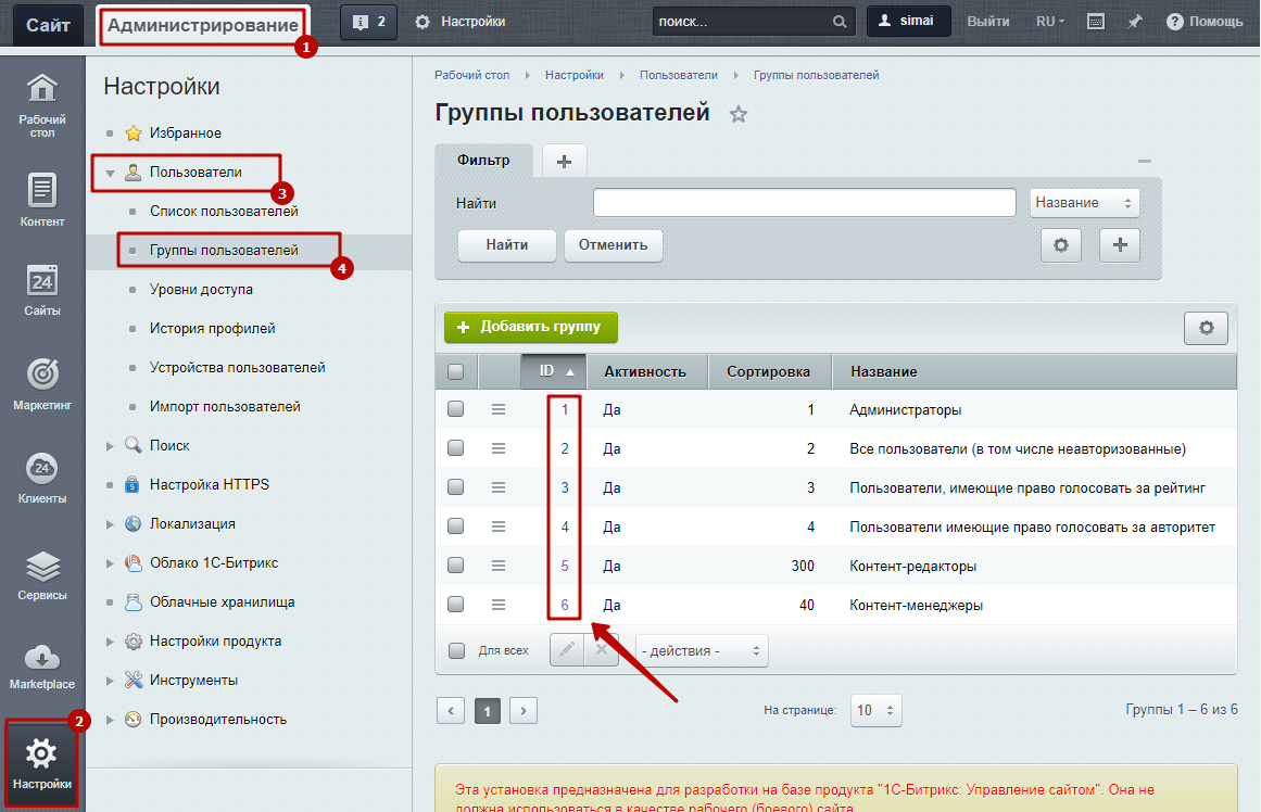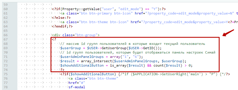 Для примера в этом коде дополнительно к группе администраторов "1" прописана группа пользователей с id "6". При необходимости нужно изменить это значение на id вашей группы.