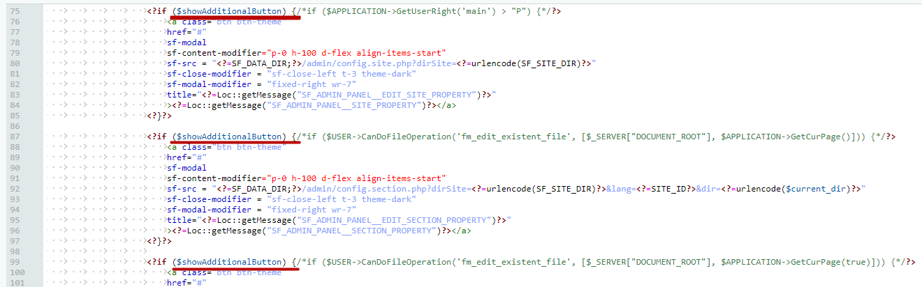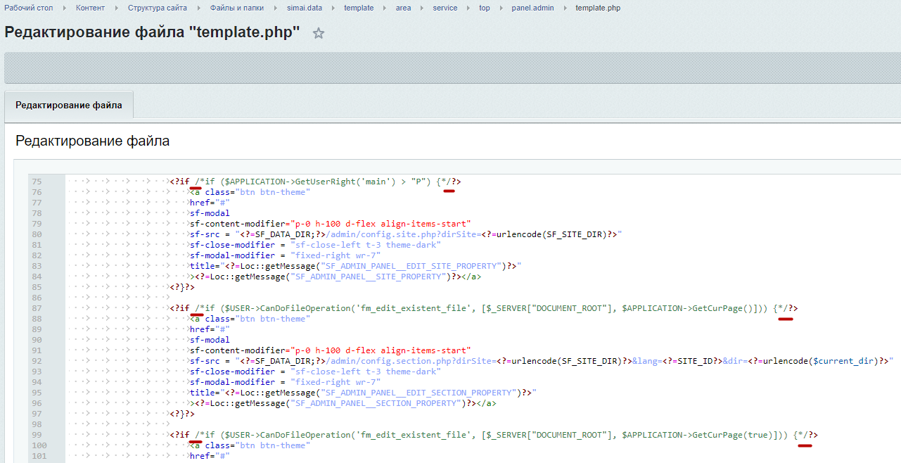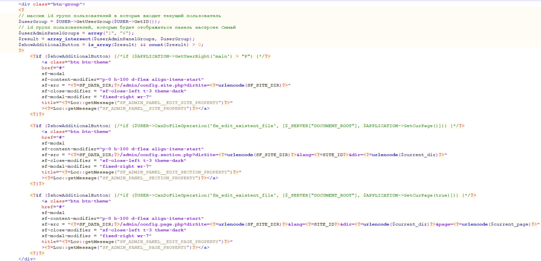 При возникновении необходимости предоставления прав доступа к определенной группе пользователей, например, контент-редакторам, к функционалу этой панели, необходимо вносить изменения в код файлов по инструкции ниже.