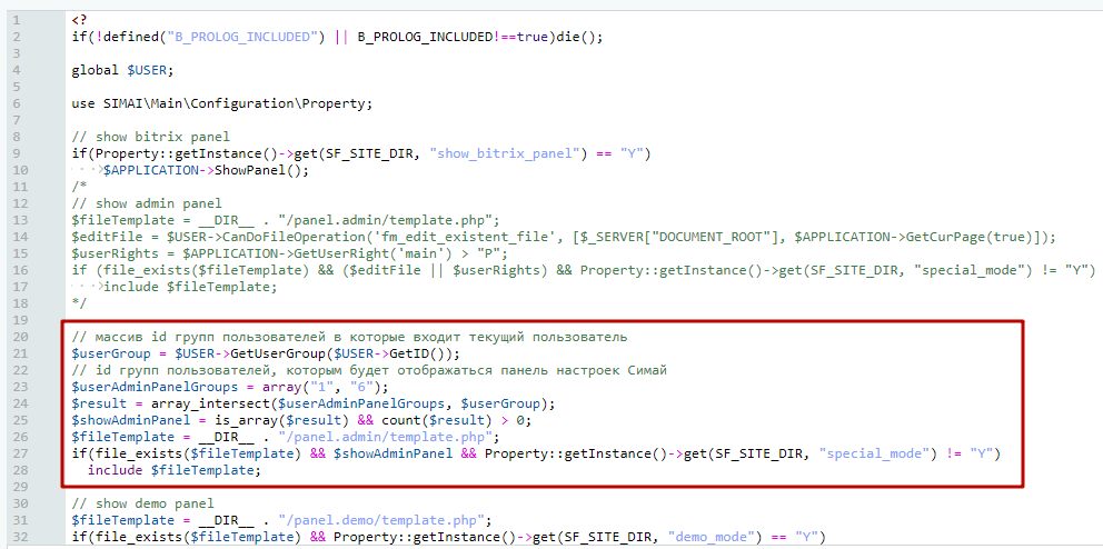 В коде в строке $userAdminPanelGroups = array("1", "6"); в двойных кавычках необходимо указать id группы пользователей, для которых мы открываем доступ к панели настроек.
