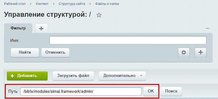 Шаг 3.1. В поисковой строке прописать путь /bitrix/modules/simai.framework/admin/ и нажать "ОК".