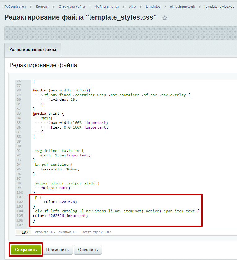 Шаг 4. Прописать в конце файла код. Где после # указан код цвета. И сохранить изменения. Если после сохранения изменений не видно в публичной части сайта, нужно сбросить кеш.