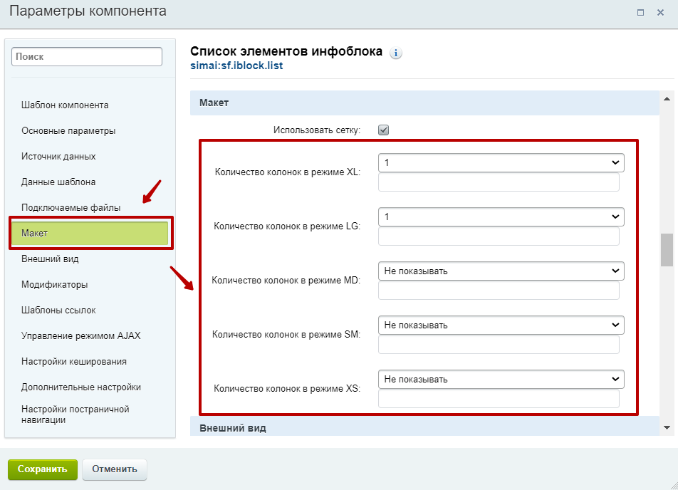 Шаг 3. В открывшемся окне настройки параметров компонента перейти на вкладку "Макет" и установить отображение для разных режимов экрана.