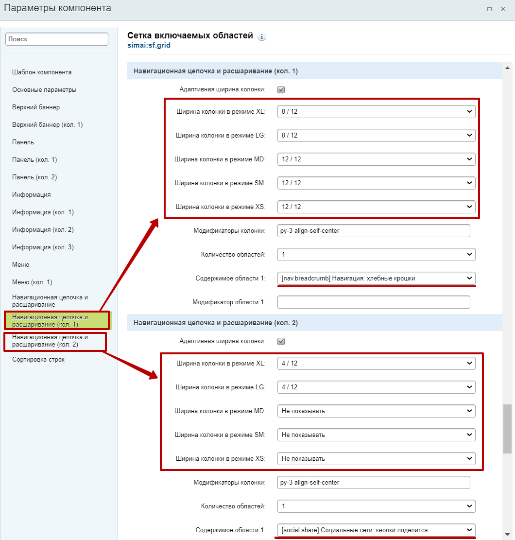 Шаг 3. В открывшемся окне настройки параметров грида настроить ширину колонок в строке "Навигационная цепочка и расшаривание".