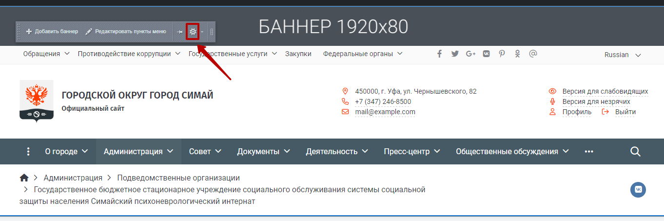 Шаг 2. Навести курсор мыши на шапку (хедер) сайта и нажать на шестерёнку.