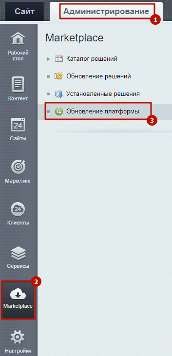 Шаг 1. Перейти Администрирование > Marketplace > Обновление платформы.