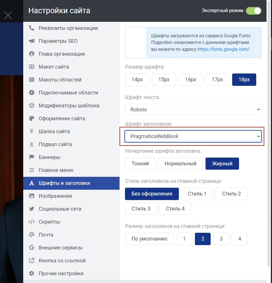 Если всё было сделано верно, то в настройках сайта появится добавленный шрифт.