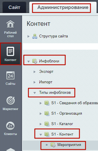 Шаг 1. Перейти в настройки инфоблока. Администрирование > Контент > Инфоблоки > Типы инфоблоков > Контент > Мероприятия.