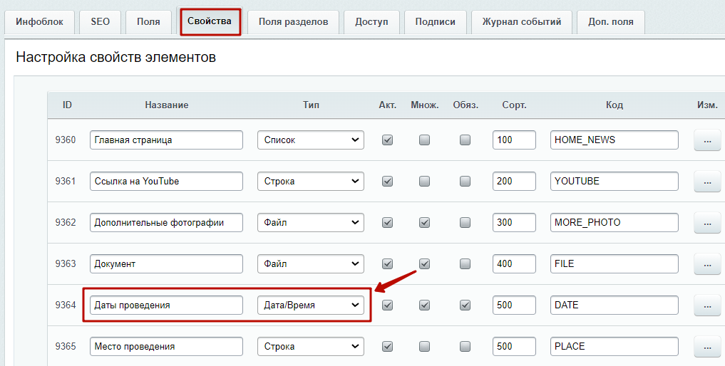 Шаг 2. В настройках инфоблоках перейти на вкладку "Свойства". И у свойства "Даты проведения" указать тип "Дата/Время".