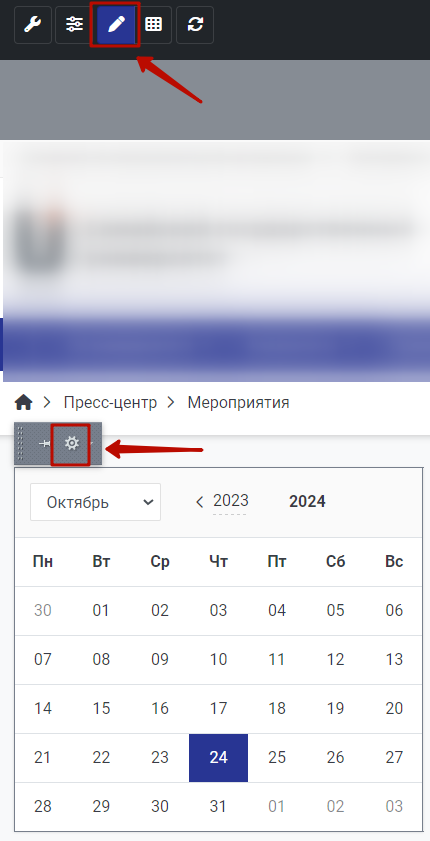 Навести курсор мыши на календарь и нажать на шестерёнку.