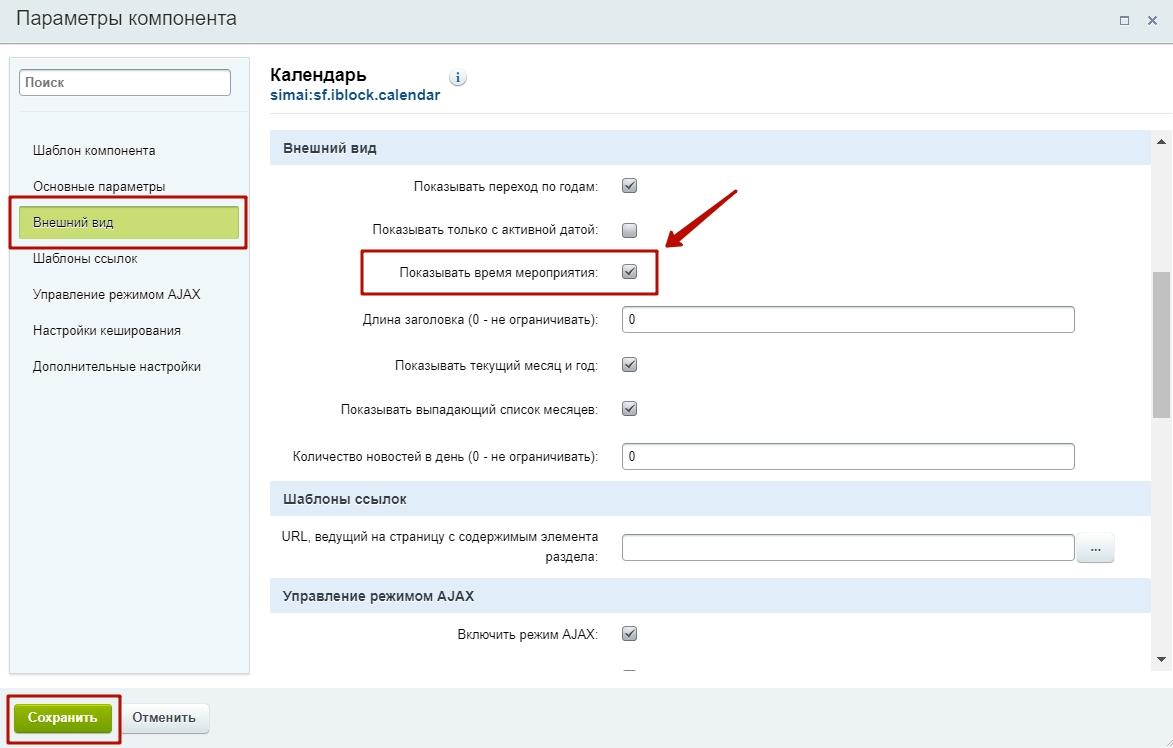 Шаг 5. В открывшемся окне параметров компонента поставить галочку у параметра "Показывать время мероприятия". Созранить изменения.