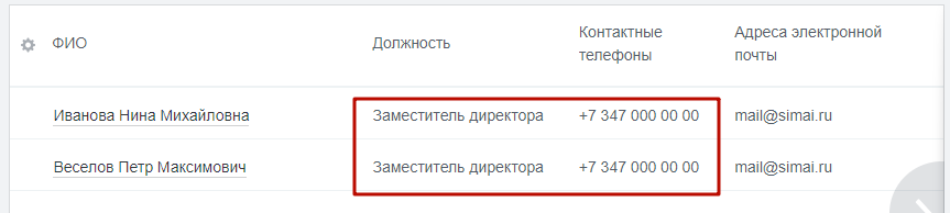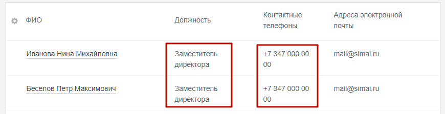 При необходимости вывода какой-либо информации в одну строку, например "Должность" или "Контактные телефоны", необходимо выполнить следующие действия: