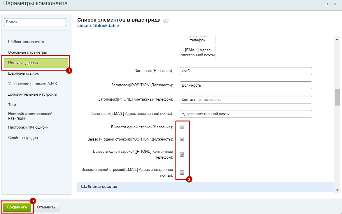 Шаг 2. В открывшемся окне настройки параметров компонента во вкладке "Источник данных" проставить галочки у параметров "Вывести одной строкой" (название колонки). Сохранить изменения.