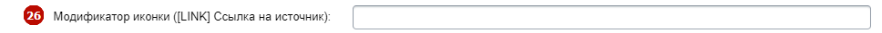 Если в блоке "Данные шаблона" в параметре "Области показа" выбран тип данных "Свойства", в параметре "Отображаемые свойства" выбраны значения, у параметра "Использовать для свойств иконки" установлена галочка, то в блоке "Модификаторы" для каждого выбранного свойства появится параметр для установки модификатора иконки. Например, выбрано свойство "Ссылка на источник", код свойства инфоблока "LINK". Параметр модификатора отобразится следующим образом: