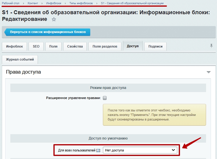 Шаг 3. Перейти в административной части сайта к редактированию инфоблока по пути Рабочий стол > Контент > Инфоблоки > Типы инфоблоков > [Название инфоблока].