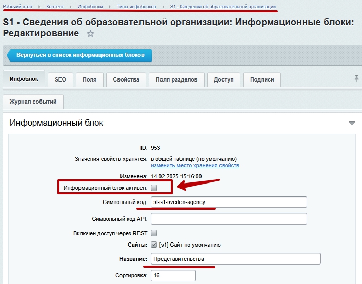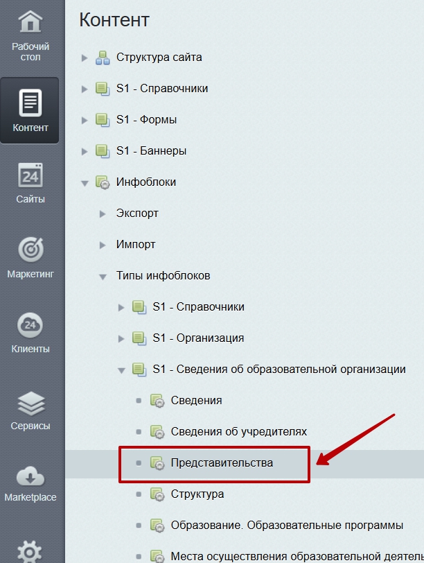 Например, Рабочий стол > Контент > Инфоблоки > Типы инфоблоков > S1 - Сведения об образовательной организации > Представительства.