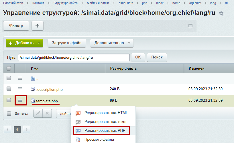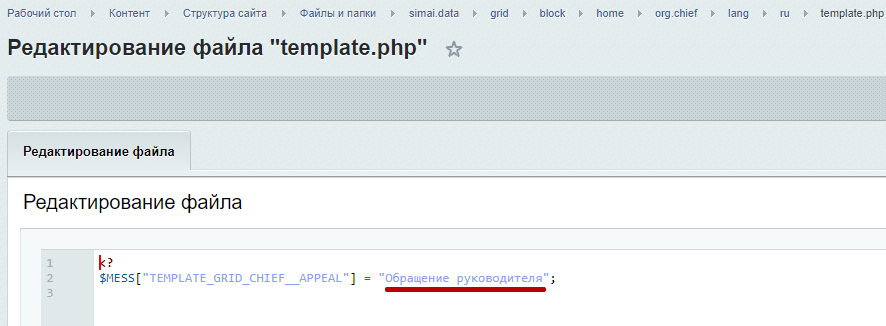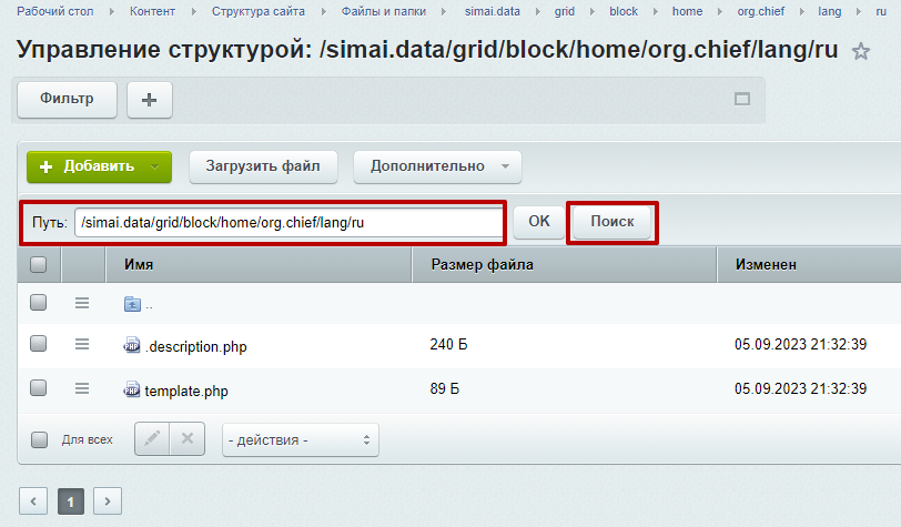 • Если сайт размещен в папке, то: /директория(например, /ru)/simai.data/grid/block/home/org.chief/lang/ru