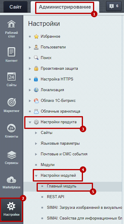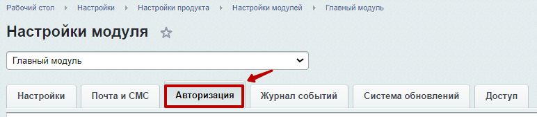 Шаг 1. Перейти в Администрирование > Настройки > Настройки продукта > Настройки модулей > Главный модуль.