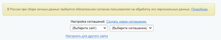 Шаг 3. Установить значения в параметре "Настройка соглашений". Выбрать сайт и соглашение.