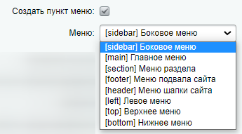 3. Если раздел необходимо вывести в публичной части в меню, то нужно поставить галочку "Создать пункт меню" и выбрать тип меню. Все типы меню и разные сценарии описаны выше в этом уроке.