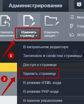 Для редактирования страницы необходимо на панели администрирования нажать на "Изменение страницы" и выбрать действие: