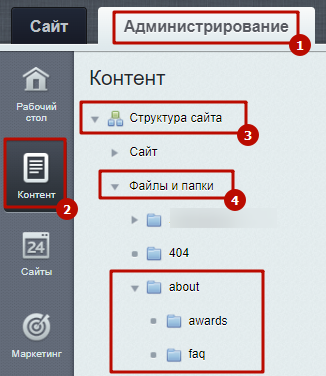 Шаг 1. Перейти в Администрирование > Контент > Структура сайта > Файлы и папки > выбрать папку (раздел), в которой нужно создать подраздел.