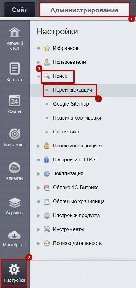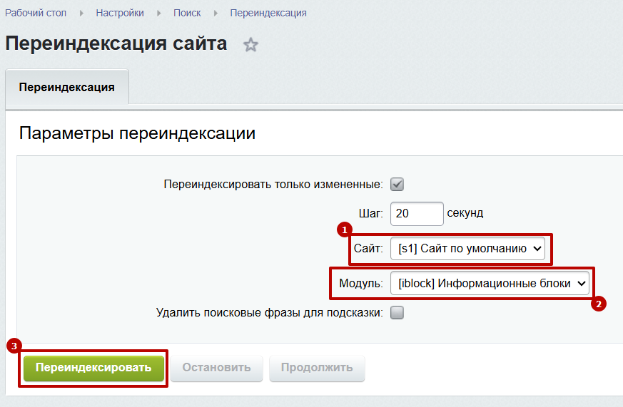 Шаг 5. Выбрать сайт, модуль: [iblock] Информационные блоки и нажать "Переиндексировать".