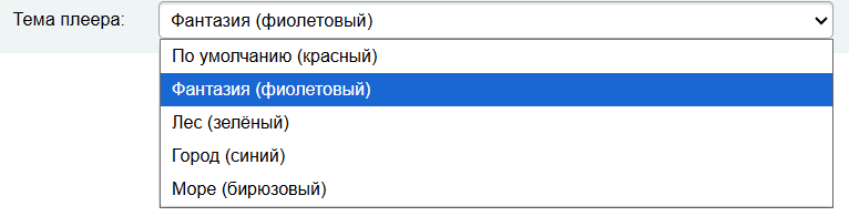 В параметре "Тема плеера" можно выбрать цветовую тему из представленных вариантов. В этот цвет окрасится кнопка воспроизведения видео.